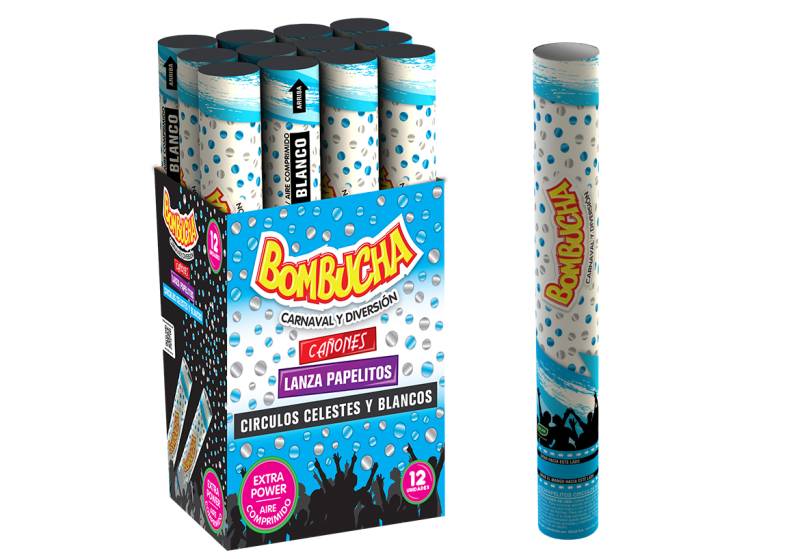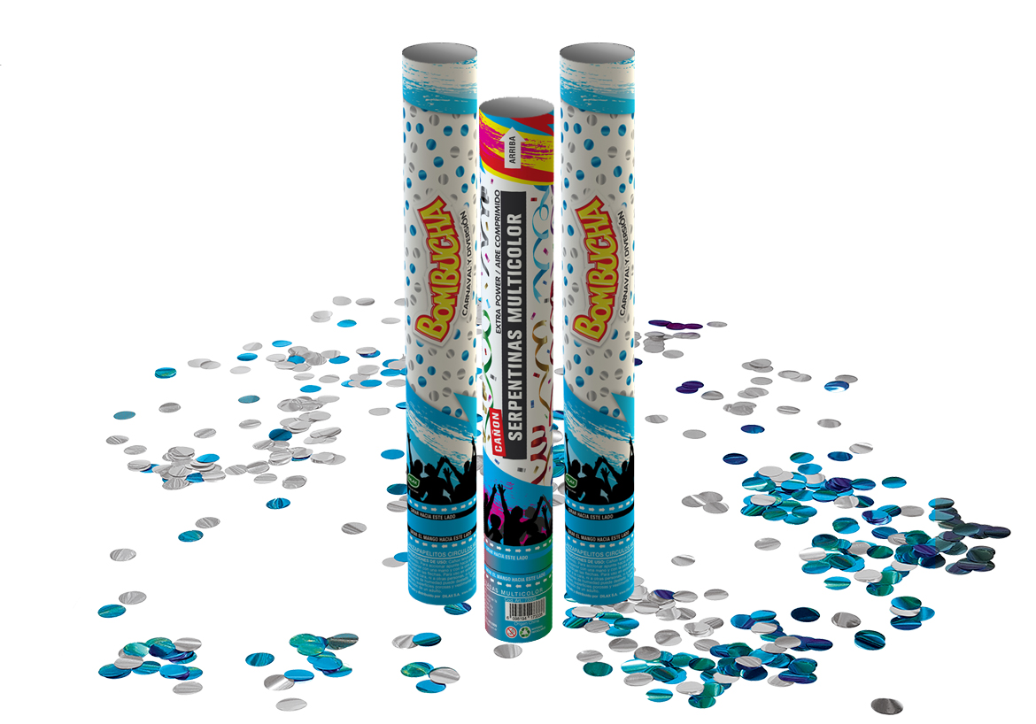CAÑON LANZA SERPENTINAS METALIZADO CELESTE Y BLANCO