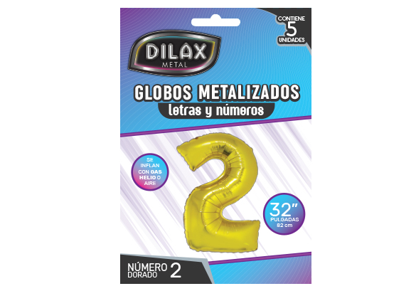 Número 2 (Dos) doradoGlobo mylar: 32 pulgadasModelo: DLX-BL1 BIG BALLOONMedida del blister: 20 x 13,9 x 1 cmBLISTER: 5 unidadesCAJA: