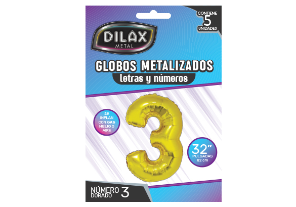 Número 3 (Tres) doradoGlobo mylar: 32 pulgadasModelo: DLX-BL1 BIG BALLOONMedida del blister: 20 x 13,9 x 1 cmBLISTER: 5 unidadesCAJA: