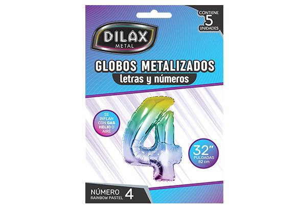 Número 4 (Cautro) rainbow pastelGlobo mylar: 32 pulgadasModelo: DLX-BL1 BIG BALLOONMedida del blister: 20 x 13,9 x 1 cmBLISTER: 5 unidadesCAJA: