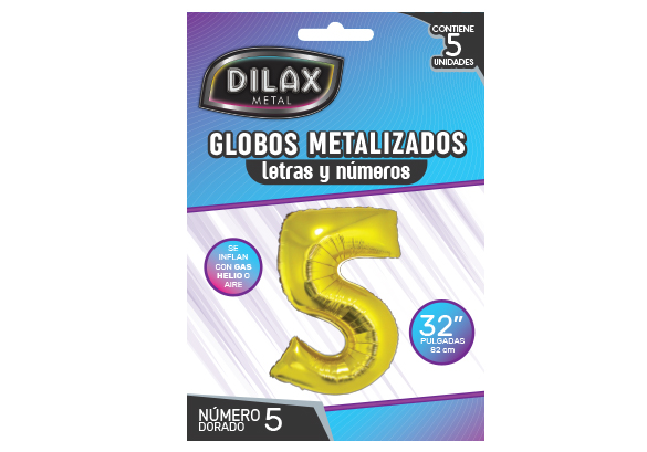 Número 5 (Cinco) doradoGlobo mylar: 32 pulgadasModelo: DLX-BL1 BIG BALLOONMedida del blister: 20 x 13,9 x 1 cmBLISTER: 5 unidadesCAJA: