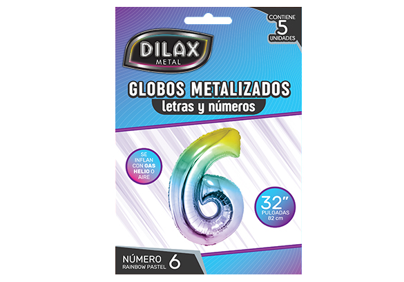 Número 6 (Seis) rainbow pastelGlobo mylar: 32 pulgadasModelo: DLX-BL1 BIG BALLOONMedida del blister: 20 x 13,9 x 1 cmBLISTER: 5 unidadesCAJA: