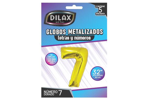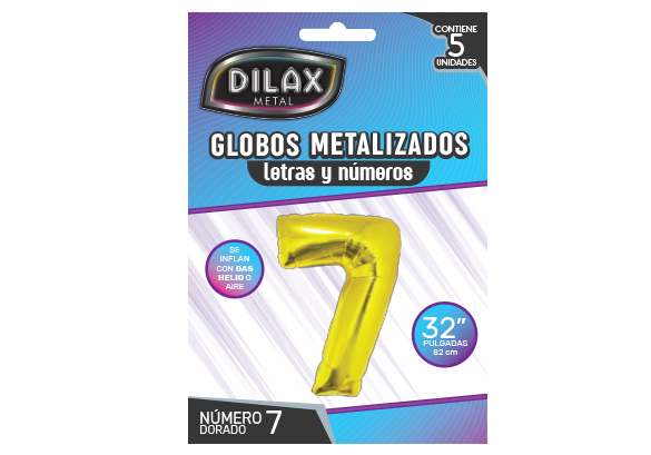 Número 7 (Siete) doradoGlobo mylar: 32 pulgadasModelo: DLX-BL1 BIG BALLOONMedida del blister: 20 x 13,9 x 1 cmBLISTER: 5 unidadesCAJA: