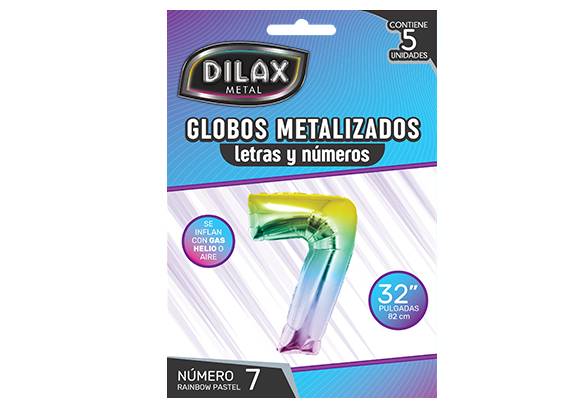 Número 7 (Siete) rainbow pastelGlobo mylar: 32 pulgadasModelo: DLX-BL1 BIG BALLOONMedida del blister: 20 x 13,9 x 1 cmBLISTER: 5 unidadesCAJA: