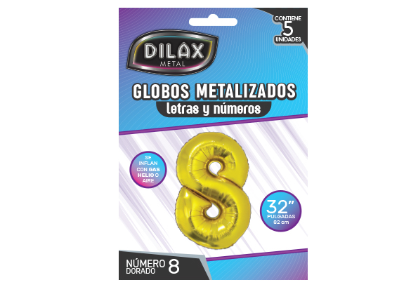 Número 8 (Ocho) doradoGlobo mylar: 32 pulgadasModelo: DLX-BL1 BIG BALLOONMedida del blister: 20 x 13,9 x 1 cmBLISTER: 5 unidadesCAJA: