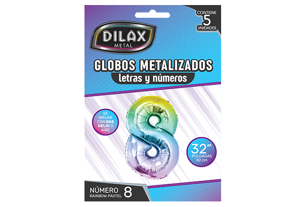 Número 8 (Ocho) rainbow pastelGlobo mylar: 32 pulgadasModelo: DLX-BL1 BIG BALLOONMedida del blister: 20 x 13,9 x 1 cmBLISTER: 5 unidadesCAJA: